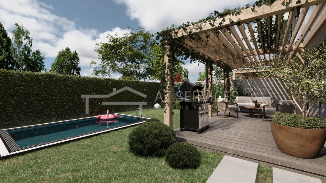 – priestranný obývací priestor s kuchyňou (42,35 m²) a priamym vstupom na terasu (18,21 m²) a záhradu (51,93 m²)