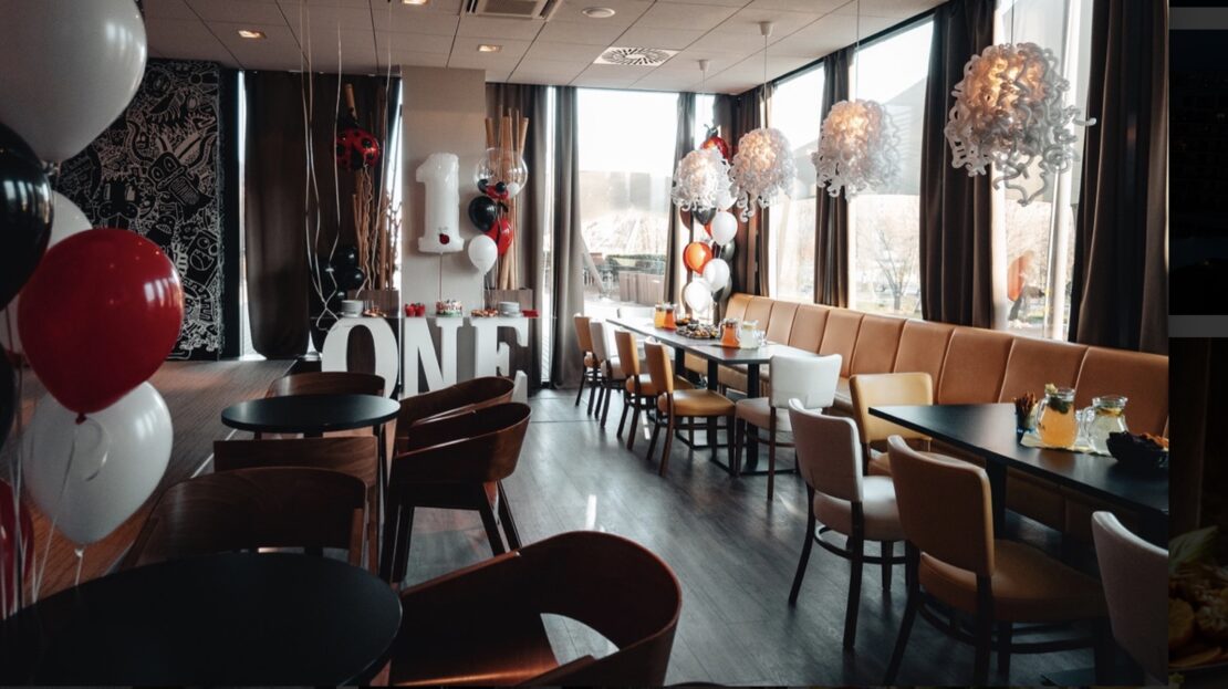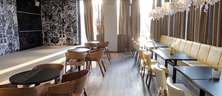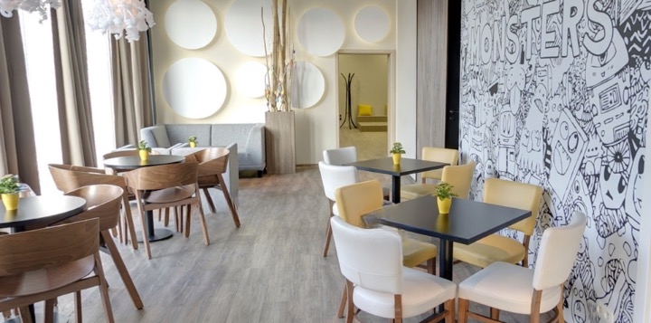 Dispozícia priestoru je premyslená a funkčná: barová časť, priestranná kaviarenská zóna s detským kútikom, hygienické zariadenia pre hostí (zvlášť pre ženy a mužov), šatne a zázemie pre zamestnancov, sklad a miestnosť pre upratovanie.